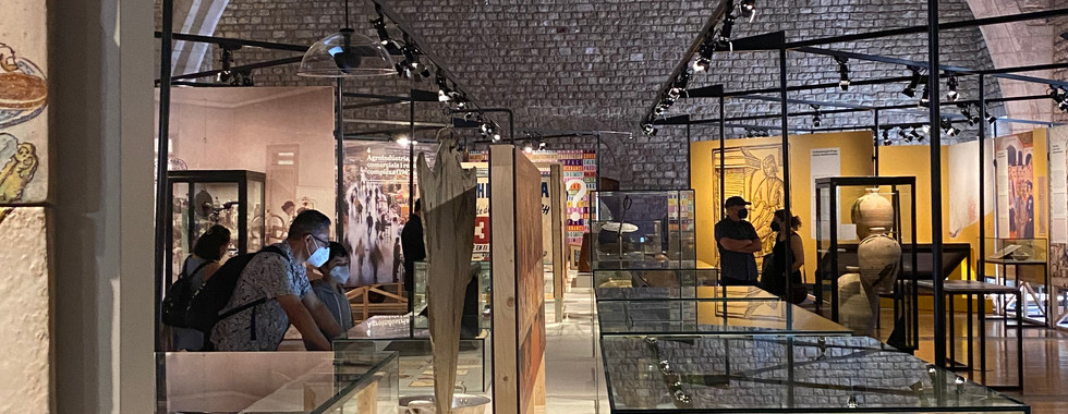 El Saló del Tinell és l’estança escollida pel desplegament de l’itinerari dissenyat, que ofereix un espai ben distribuït. El recorregut és accessible per persones amb discapacitat física i senzill de seguir, ja que les indicacions per cada apartat i la separació entre cadascun estan ben assenyalats. La composició dels materials exposats ajuda a que la informació sigui comprensible i fins i tot estèticament agradable. Un dels aspectes més encertats és el seu suport visual: des de quadres i pòsters d’època, passant per documents històrics oficials, tot tipus de mapes, pergamins, objectes físics com estris de cuina o rajoles antigues i d’altres tipus de fonts primàries.